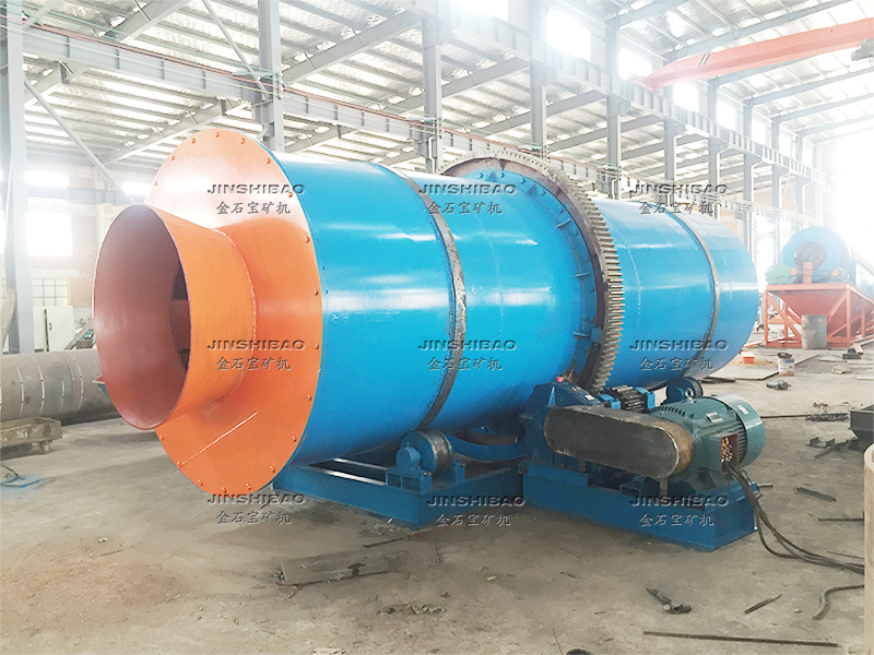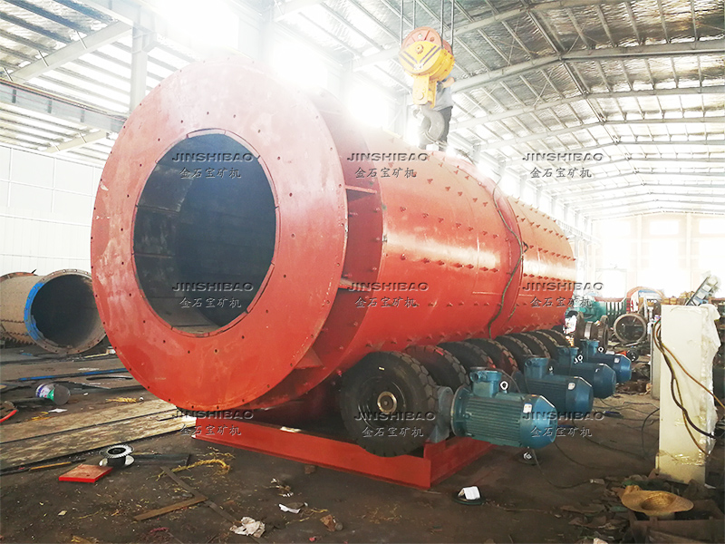 滚筒洗矿机的筒体由四个滚轮支撑,电机带动减速机传动,大小齿轮带动清洗筒体低速旋转。含有泥团或石粉的物料从进料口给入,进入旋转的滚筒内,清洗滚筒内壁安装有一定角度的搅拌叶片,同时物料不断被带起抛落,自进料端到出料端移动过程中多次循环,并被顺向或逆向的高压冲洗水冲刷洗涤,清洗干净的物料经过尾部出料端筛分脱水后排出,从而达到洗矿、筛分、脱泥作业。