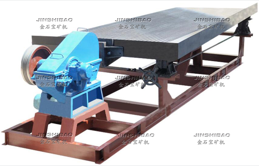 云锡摇床主要由床面、床头、溜动设备三大部分组成。床面由床架部分和给矿槽等部分组成。床面支撑在溜动设备上,由床头的床面挂钩连接床面,在床头的推动下使床面往复运动进行选矿。 床头系采用偏心轴带动偏心滚轮来推动摇杆支臂,例摇杆支臂叉推动联接丁头螺杆,因而使螺杆往复运动。床头润滑轴承系采用ZQSN5-5-5材料作为滑动轴承,具有噪音小转动灵活等特点。溜动设备部分主要是用来调节选矿设备所需要坡度,利用手轮调节斜度托板,使床面产生坡度。