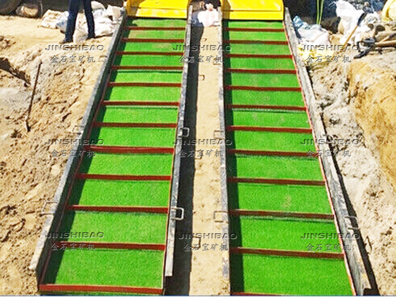 通常是根据固定溜槽(倾斜溜槽)的槽体尺寸将粘金毯裁切成相应大小并固定在固定溜槽上。固定溜槽是一种非常简单的重选设备,在黄金选矿的应用十分普遍,固定溜槽与水平面有一定的角度,槽内铺设粘金毯,用于捕收颗粒金和游离金。固定溜槽安装角度一般为10~13度,给矿粒度大时,倾斜角度应该相应大些。
